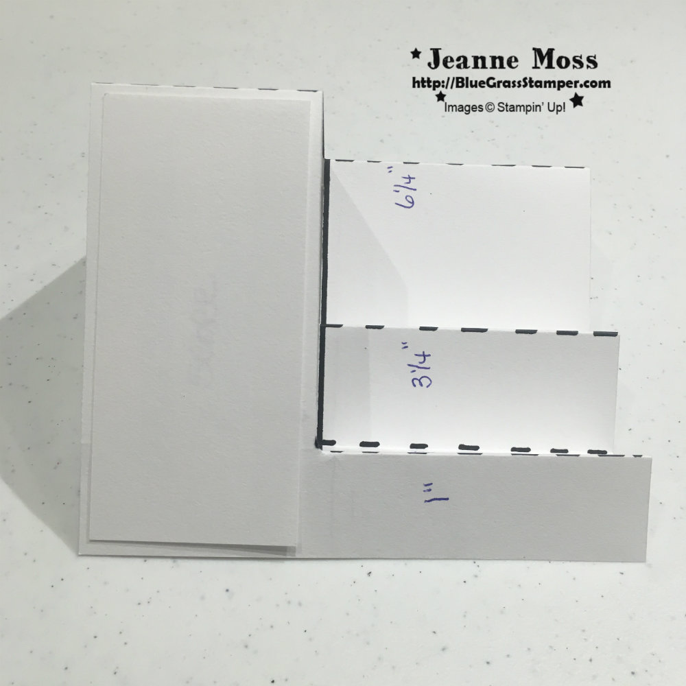 For example, I was doing this card for a class, and needed to be frugal with my Designer Series Paper. I wanted to use a piece that was 2″ X 4″, so I could get several from one sheet of 12″X12″ paper with no waste. This meant I wanted the left front portion of my card to measure 2 1/4″ x 4 1/4″. My measurements and instructions are for my card, but you can change them to suit your own needs.