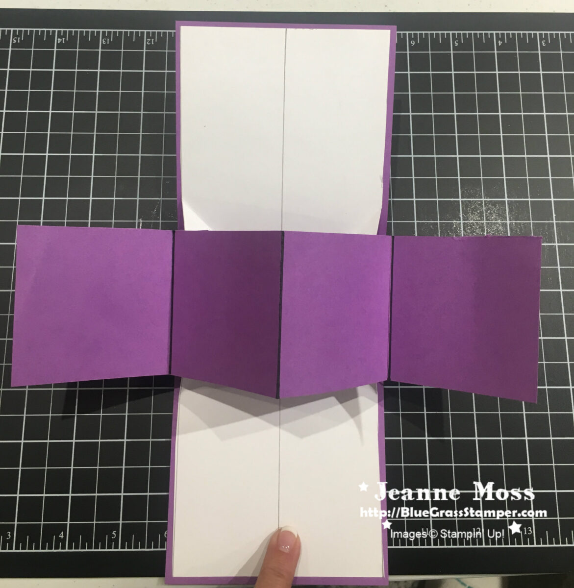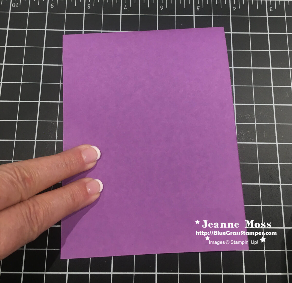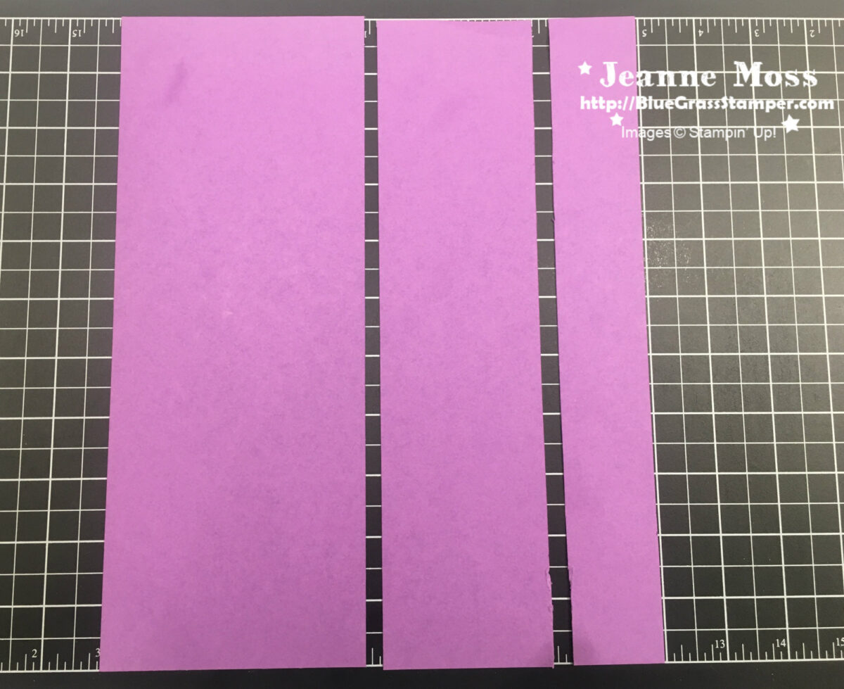 First, you’ll need two sheets of 8 1/2 x 11 cardstock. I’m using purple and white just so you can see what I’m doing. Cut the purple sheet in half vertically at 4 1/4″. Cut one of these pieces at 2 3/4″, so you’ll have a piece that is 2 3/4″ x 11. You’ll only need these two pieces, so you can save the smallest piece for a future project.