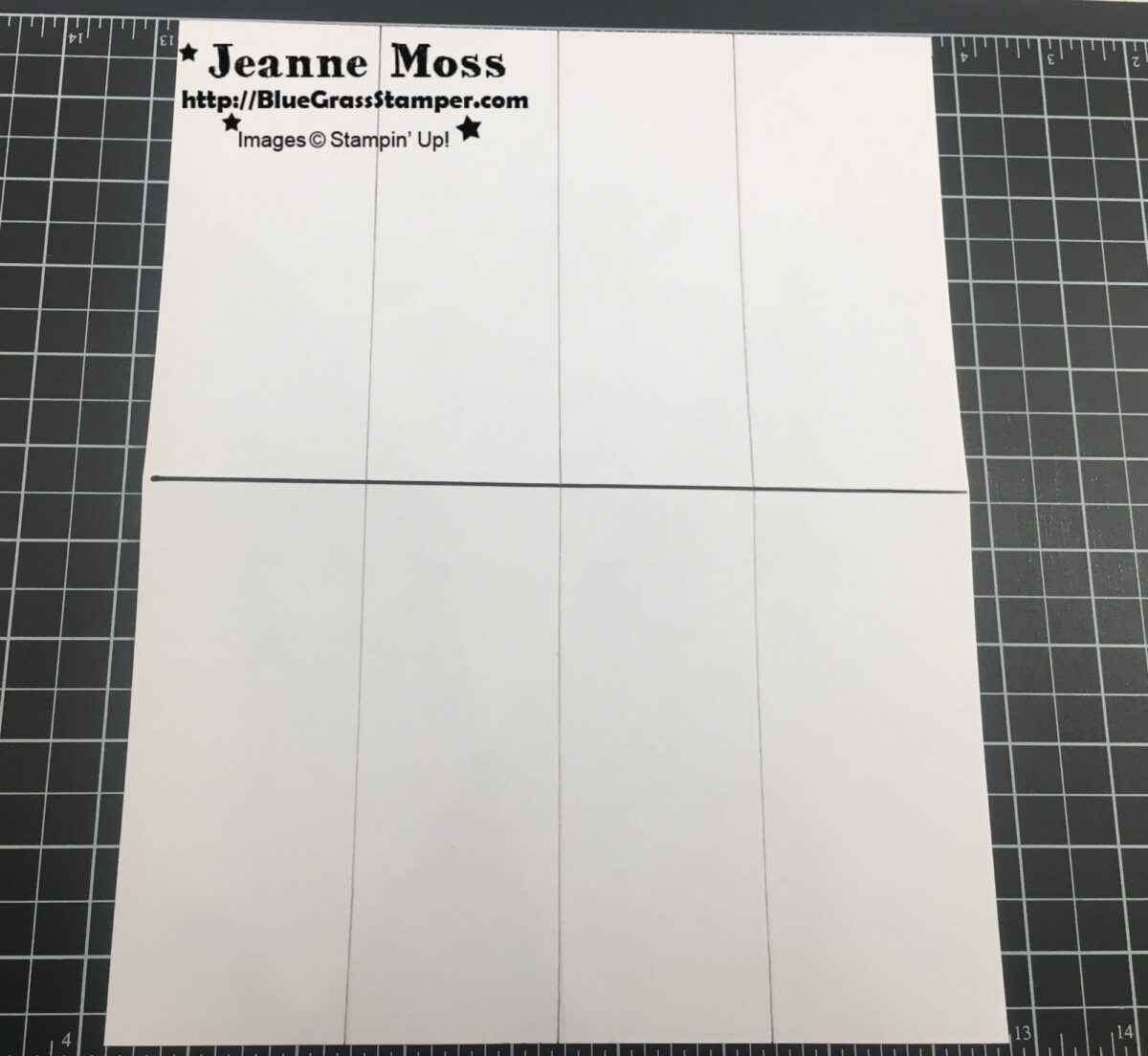 Fold the 4 1/4″ x 11″ piece in half at 5 1/5″. This will be your card base. Score the 2 3/4″ x 11″ strip at 2 3/4″, 5 1/5″, and 8 1/4″. This will be the four panel piece. Fold it accordian style. It should look like a W.