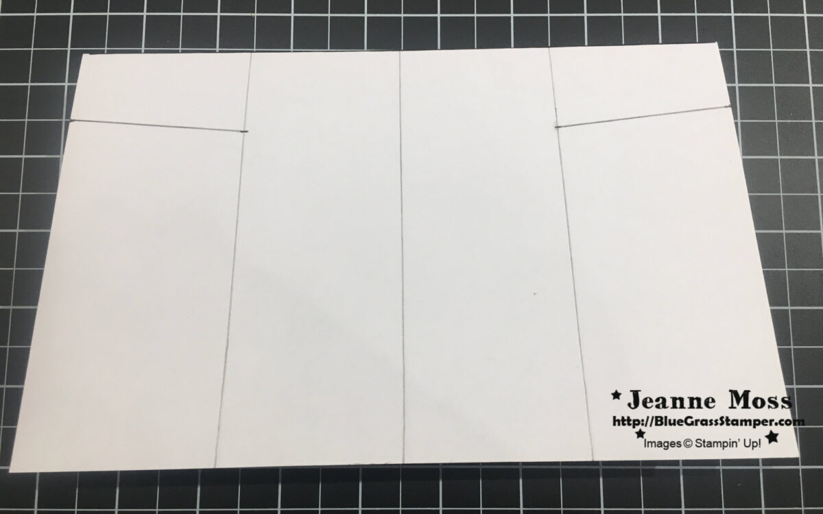Fold in half on the 5 3/8″ score line. Take a ruler and measure 1″ from the fold and use a pencil to mark the edge of the card stock. Repeat on the other side.